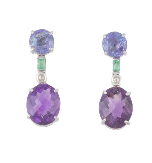 Pendientes largos con tanzanitas, de las que pende amatista oval colgante de brillante y esmeralda
