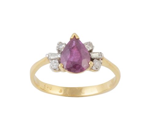 230. Sortija con rubí talla pera flanqueado por parejas de brillantes y diamante talla baguette