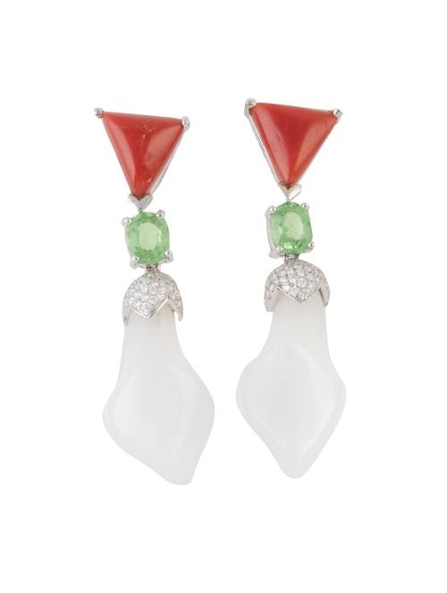 Pendientes largos con flores de ágata blanca decoradas con capuchones de brillantes, que penden de granate verde oval y triángulo superior de coral