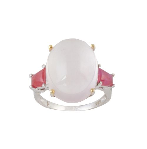 Sortija con cabuchón de cuarzo rosa flanqueado por rubíes talla trapecio y pequeñas parejas de brillantes