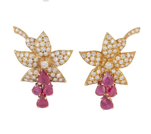Pendientes largos con diseño flor cuajada de brillantes de cuyo centro pende cascada de cuatro rubíes talla pera