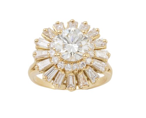 Sortija rosetón con brillante central elevado de 1,78 ct, rodeado por orla de brillantes y orla exterior de diamantes talla baguette