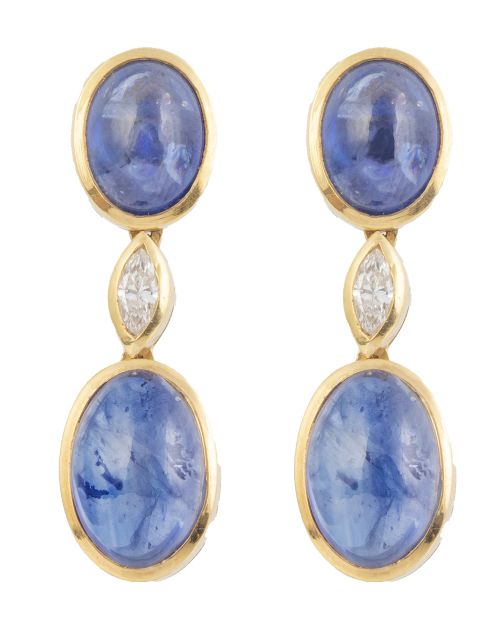 289. Pendientes largos con dos cabujones de zafiros unidos por diamante talla navette