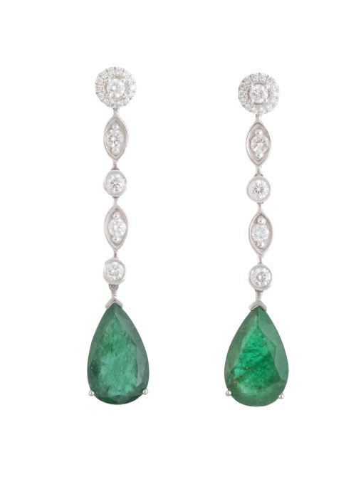 313. Pendientes largos con perillas de esmeraldas, colgantes de brillantes en marcos circulares y ojivales articulados