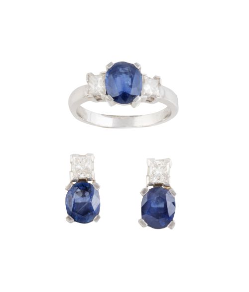 317. Conjunto de pendientes y sortija con zafiros de talla oval y diamantes talla princesa