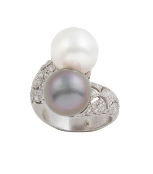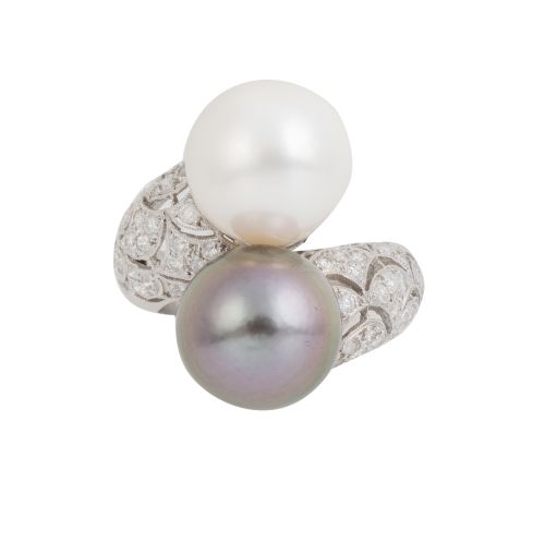 340. Sortija tu y yo con perla blanca y de Tahití en montura calada decorada con brillantes