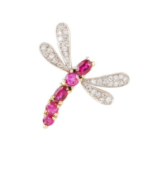 343. Broche libélula con alas de brillantes y cuerpo de rubíes ovales y redondos