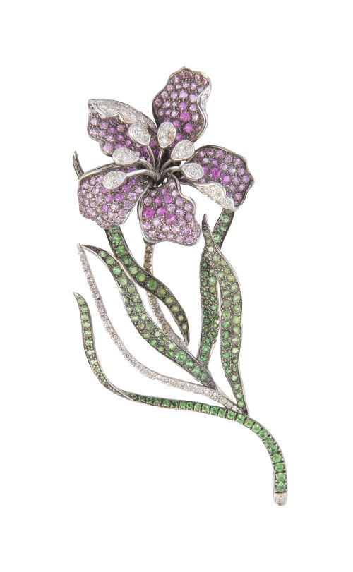 Home / SUBASTA DE JUNIO 2025 / Broche flor de zafiros rosas y brillantes en rama de hojas