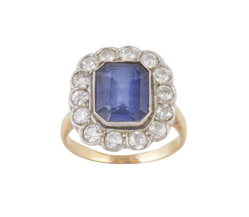Sortija de pp. S. XX con zafiro sintético de talla rectangular, orlado de brillantes de talla antigua en marco lobulado