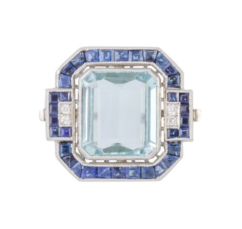 Sortija estilo Art-Decó octogonal con aguamarina central en marco de zafiros carré y brillantes