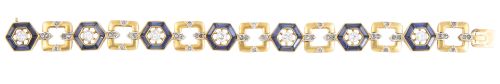 Brazalete Art-Decó con siete centros hexagonales de zafiros calibrados, con brillante en chatón central y eslabones cuadrados con diamantes