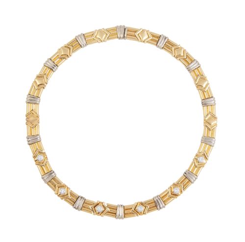 Collar tipo Bulgari en oro bicolor con decoración de gallones, y seis chatones de brillantes decorando piezas frontales