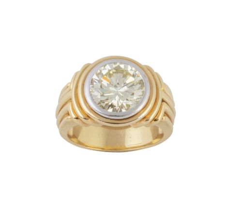 Sortija solitario con un brillante de peso estimado 3,77 ct en montura de oro gallonado