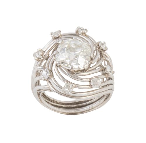 410. Sortija c.1930 con brillante central talla cojin de 1,66 ct aprox, en montura ancha realizada con hilos de platino decorada con ocho brillantes