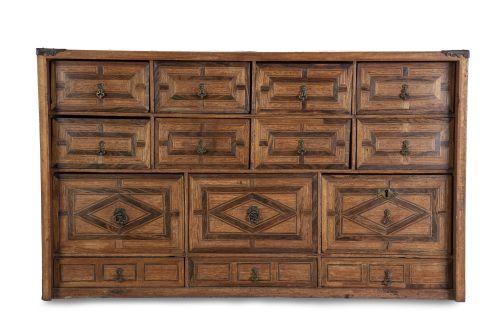 Dos filas de cajones sobre cajones más anchos, asas en los laterales insertas en un rombo.