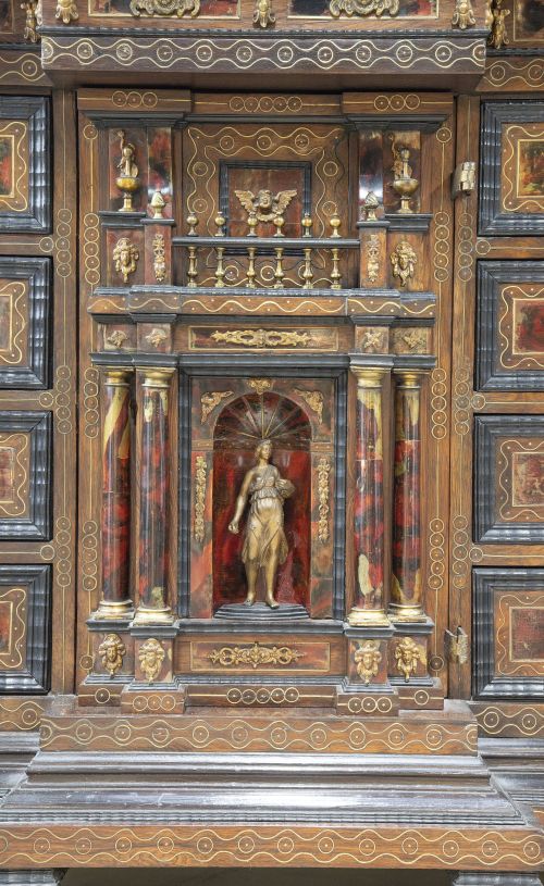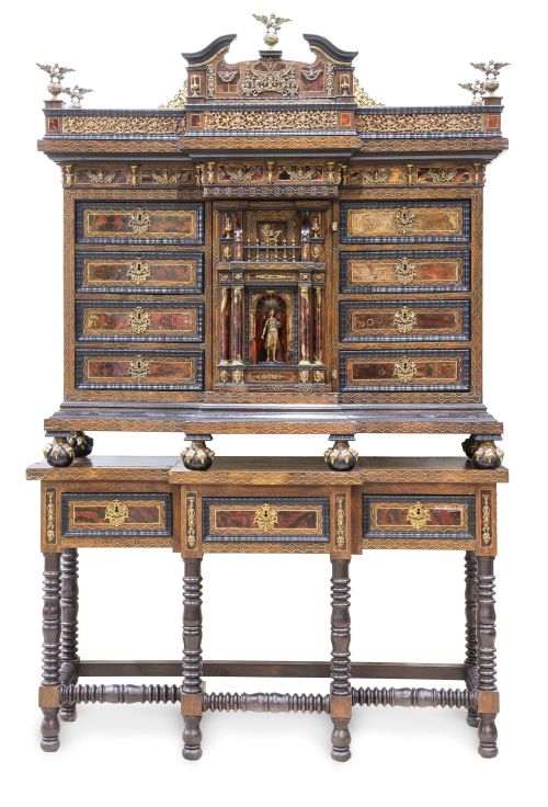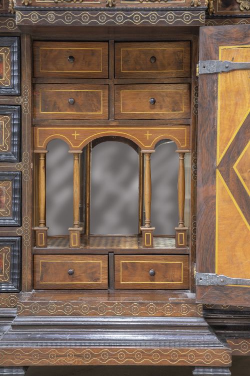 En el interior seis cajones y arquitectura fingida con cuatro columnillas, arcos, espejos y suelo ajedrezado. A cada lado de la puerta central, cuatro cajones. Apoya sobre patas en forma de garra sobre bola. La mesa con tres cajones más y patas torneadas. Algunas faltas.