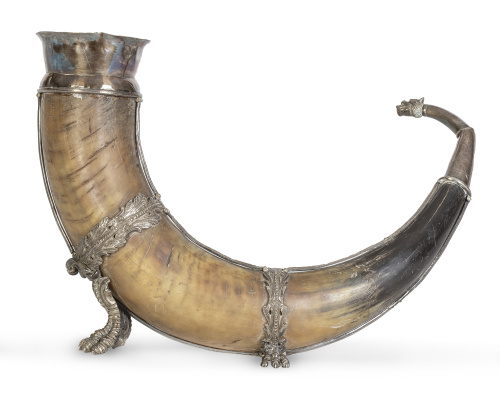 Cuerno montado en plata, rematado por pies de ave, rematado por una cabeza de dragón.