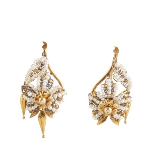 Conjunto de pendientes y broche S. XIX de motivos florales de perlas de aljofar sobre filigrana y retícula de oro