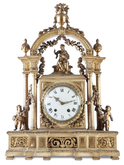 De forma arquitectónica, con un arco que alberga una alegoría de la Primavera bajo guirnaldas de flores. En la parte inferior amorcillos. Esfera de esmalte con numeración romana.