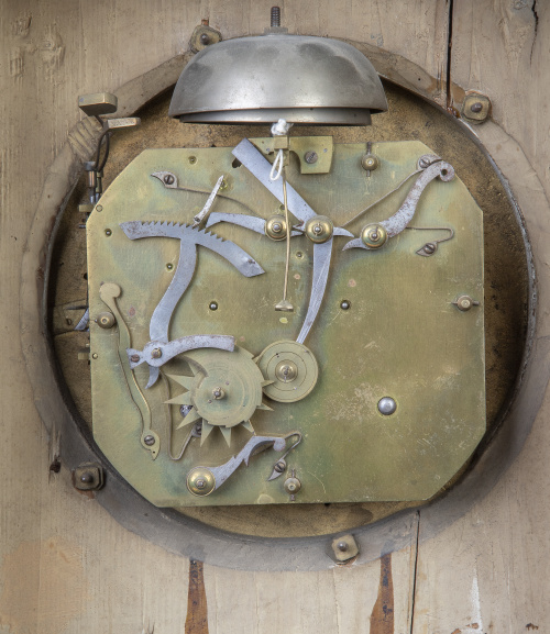 605. Reloj de pórtico de estilo Luis XVI, de madera tallada, policromada y dorada.