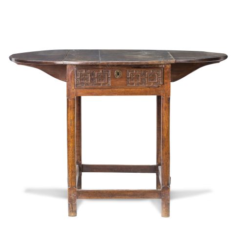 Home / SUBASTA DE JUNIO 2025 / Mesa de alas de madera con frente de talla geométrica.Cas