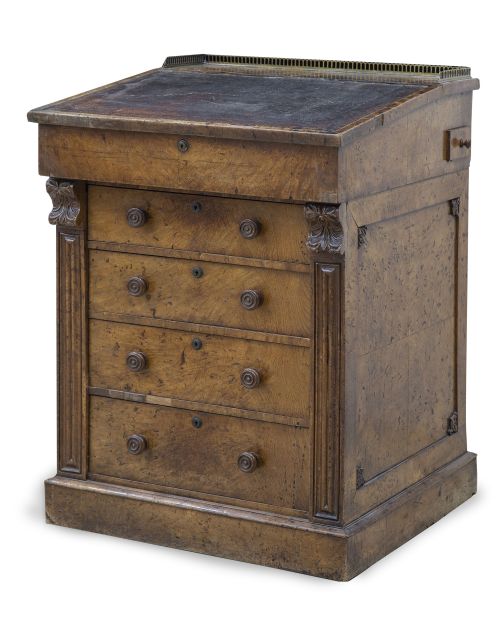 "Davenport" "regency" de madera de olmo y madera tallada. Las cerraduras marcadas J. Bramah´s patented* y S. Mordan & maker.
