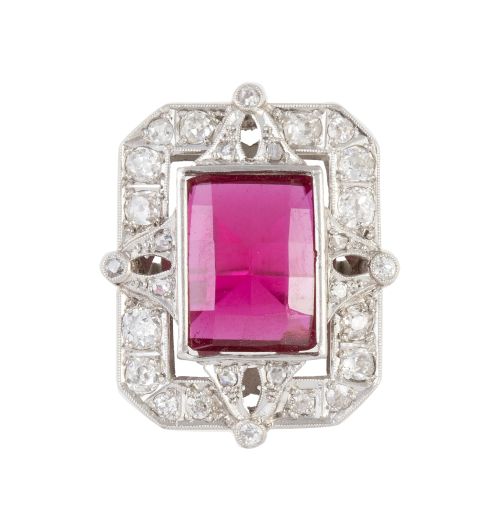 75. Sortija Art-Deco rectangular con marco calado de brillantes de talla antigua, con centro de rubí sintético facetado