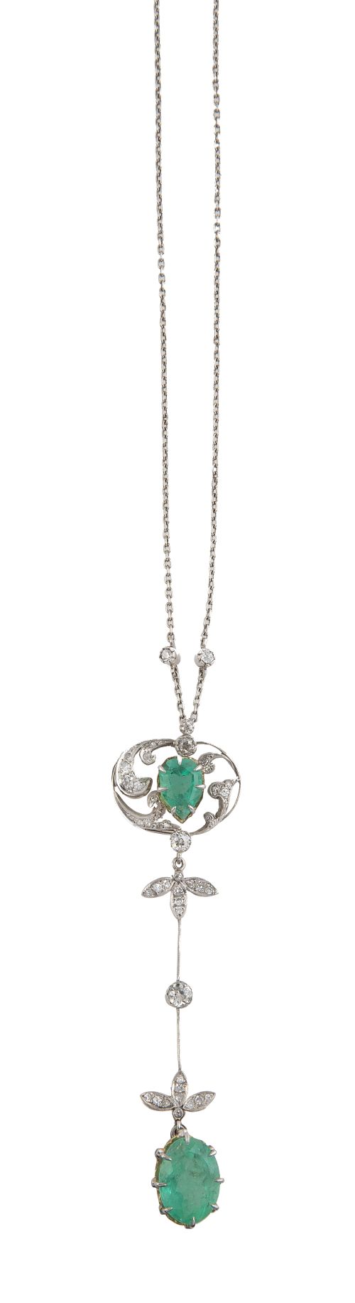 90. Pendentif de hojitas de brillantes y dos esmeraldas, una tipo pera y otra oval colgante