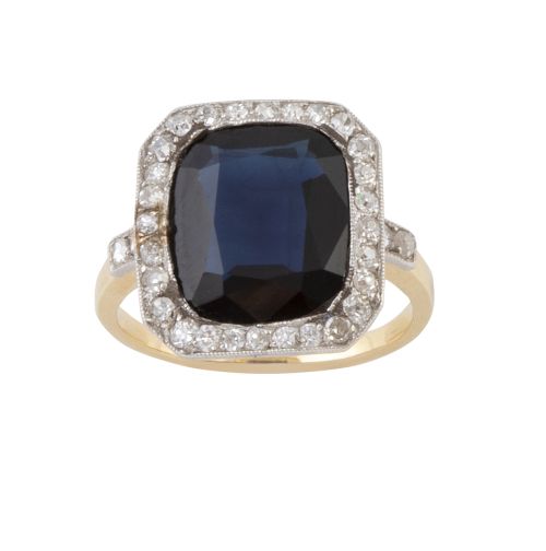 97. Sortija S. XIX con zafiro rectangular de 5,26 ct aprox orlado de diamantes