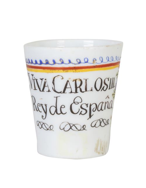Vaso en opalina con decoración esmaltada del escudo real Borbónico y la inscripción "Viva Carlos III Rey de España".
