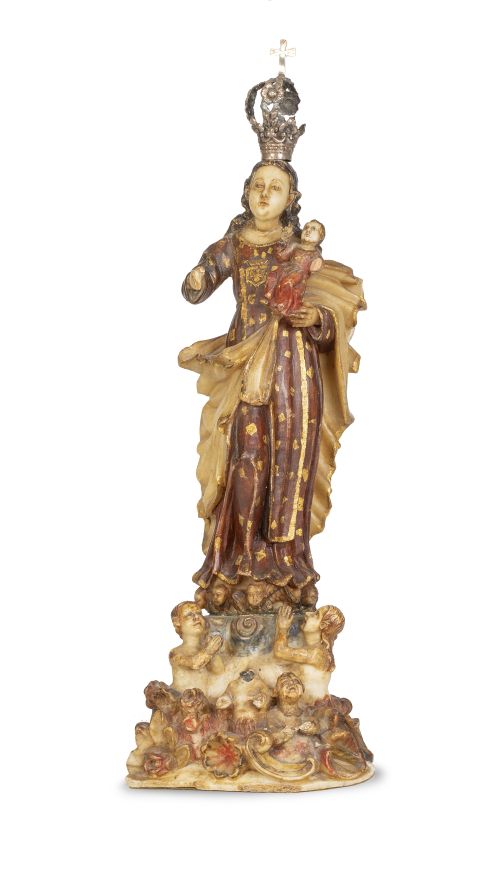 La Virgen apoya sobre base con Adán y Eva y dos puttis. Presenta desperfectos y restauraciones, faltan manos y una cabeza; la cabeza de la Virgen pegada, la corona con faltas.