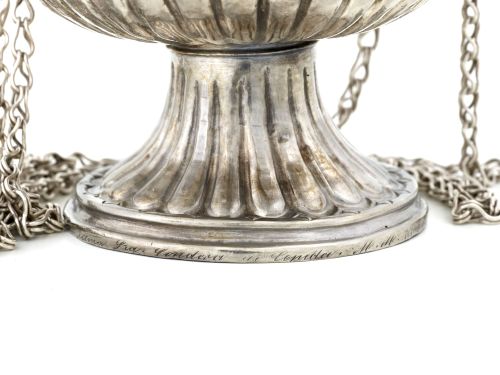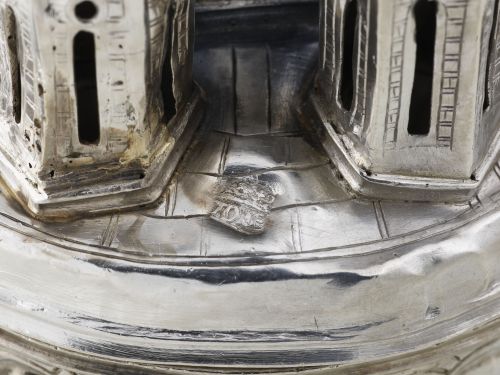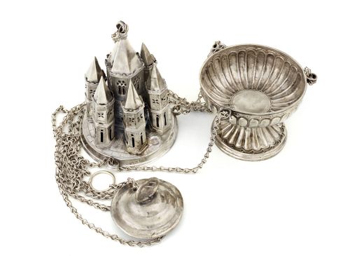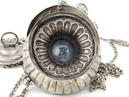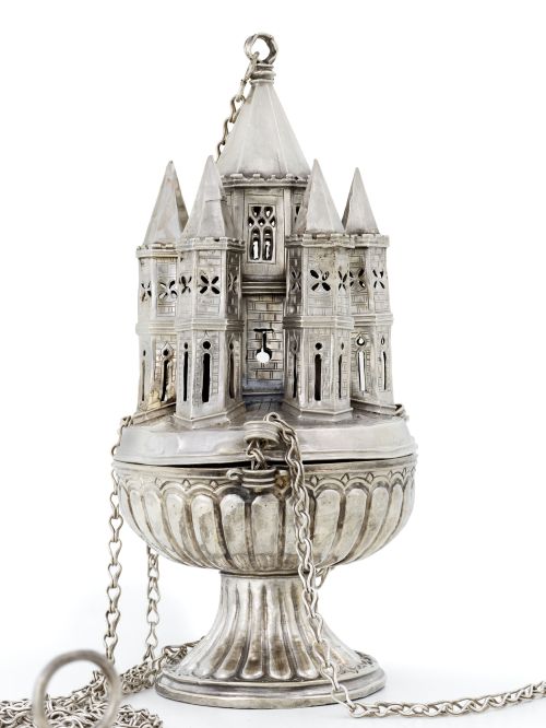 Incensario reyes católicos gótico de tipo arquitectónico en plata española punzonada.