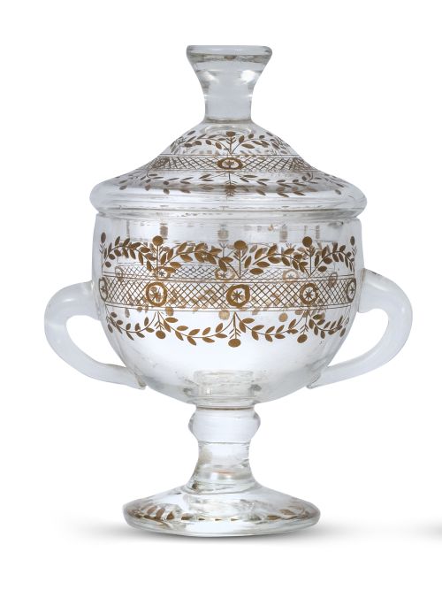 Home / SUBASTA DE JUNIO 2025 / Compotera en cristal grabado a rueda y dorada, decorada con