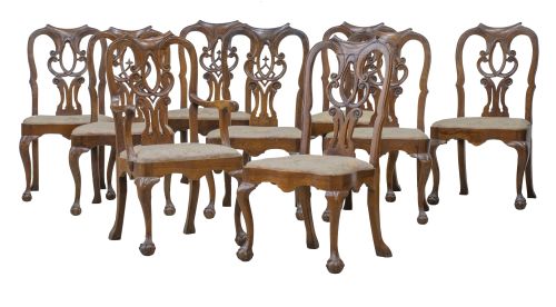 Home / SUBASTA DE JUNIO 2025 / Juego de diez sillas y dos sillas de brazos Chippendale de