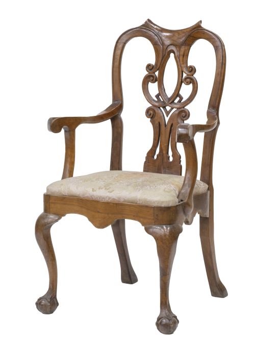 Respaldo de pala calada, asiento de chasis, patas delanteras de garra sobre bola, traseras de sable. En algunas de las sillas falta el adorno romboidal del respaldo.