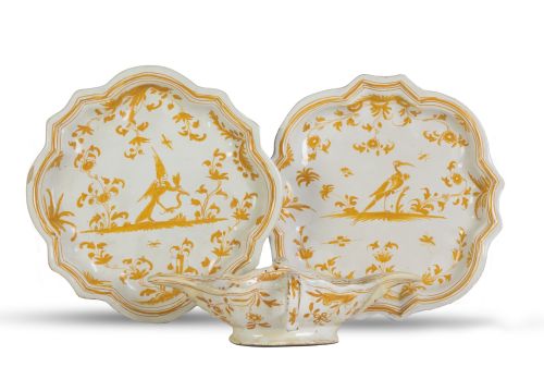 1092. Juego de dos fuentes y una salsera de cerámica esmaltada en ocre, con motivo de aves y flores.