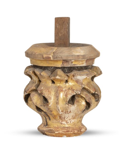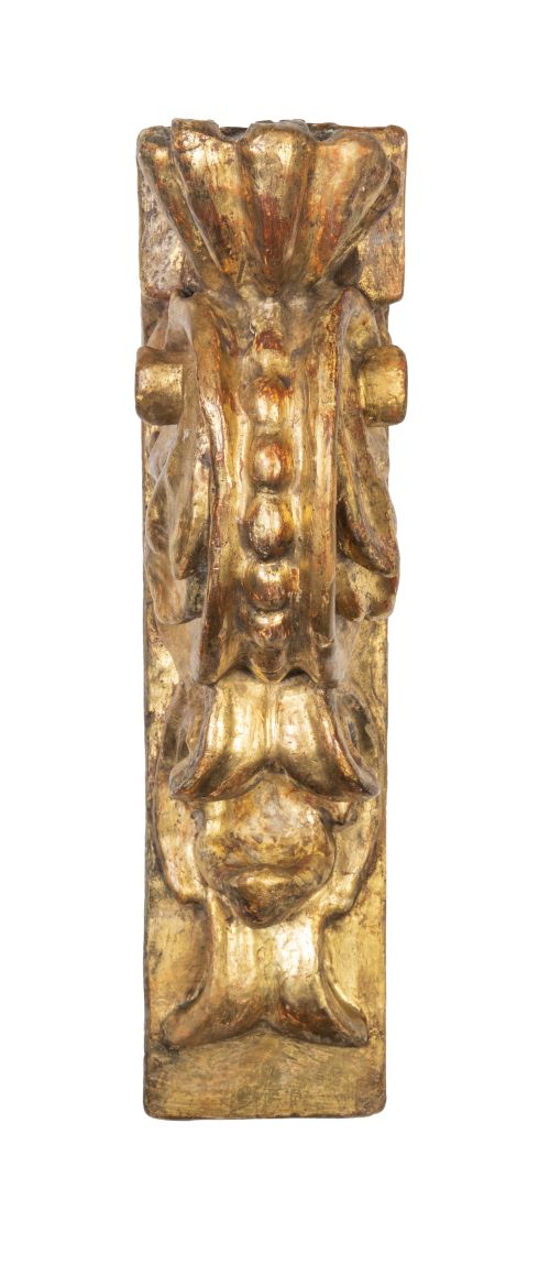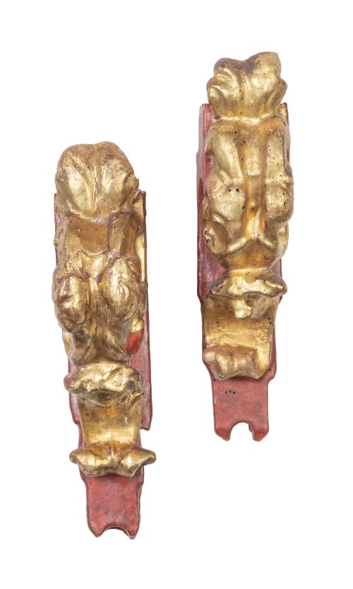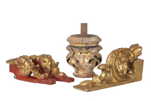 Lote formado por: dos ménsulas de madera tallada, policromada de rojo y dorada; una ménsula de madera tallada y dorada; y una peana de madera tallada y dorada.
