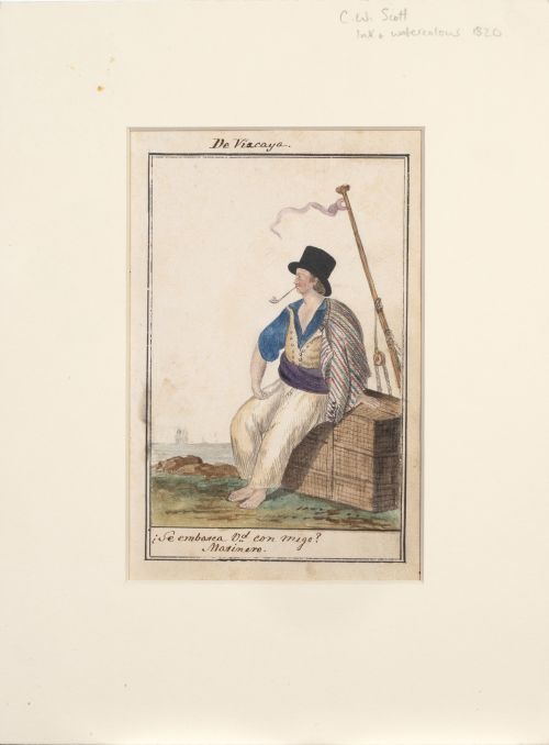 A relacionar con el grabado de José Vázquez (Córdoba, 1768- Madrid, 1804), h. 1801, 17,2 x 11 cm, conservado en el Museo Nacional del Prado con número de inventario: G005710/064. Un dibujo de Antonio Rodríguez, h. 1801,  tinta parda, aguada, pincel, tinta de hollín, lápiz negro sobre papel verjurado, 17 x 10,8 cm, se conserva en el Museo Nacional del Prado con número de inventario: D009562/072. ("Serie de la "Colección General de los Trajes que en la actualidad se usan en España: principiada en el año de 1801").