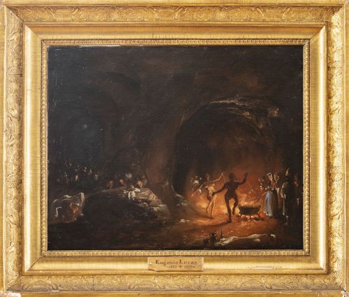Este lienzo nos transporta a una de las más inquietantes facetas del universo pictórico de Eugenio Lucas Velázquez: la representación de escenas de brujería y aquelarres. En esta fantástica composición, el artista nos introduce en una tenebrosa gruta donde se desarrolla un ritual, dominado por figuras en actitud frenética y una atmósfera cargada de fuego y misterio. La escena, ambientada en un espacio cavernoso y oscuro, da rienda suelta a la imaginación desbordada del pintor, quien se sumerge sin freno ni límites en un mundo surrealista y siniestro, habitado por personajes enigmáticos que parecen haber escapado de una pesadilla atroz