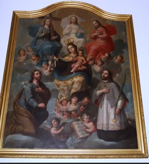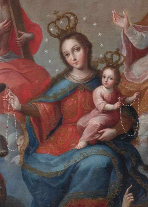 En el centro, la Virgen María, entronizada y coronada, sostiene al Niño Jesús y un rosario, símbolo de devoción, mientras la Santísima Trinidad se representa arriba: Dios Padre bendiciendo, Cristo con la Cruz en expresión meditativa y el Espíritu Santo como paloma. A los lados, el Arcángel Rafael, con un pez que alude a su rol sanador, está junto a un santo jesuita, y San Juan Nepomuceno y Santo Domingo de Guzmán se arrodillan devotamente. Esta composición es comparable a Nuestra Señora del Carmen con la Santísima Trinidad, San José y San Juan Nepomuceno de Páez, en el Monasterio de las Carmelitas Descalzas de Santa Teresa la Nueva, Ciudad de México (fig. 1).