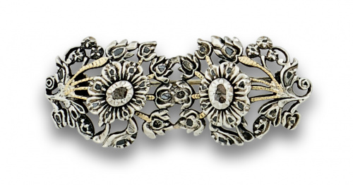 Broche s.XIX con doble centro floral de diamantes, en montura de plata y plata vermeill en anverso.
