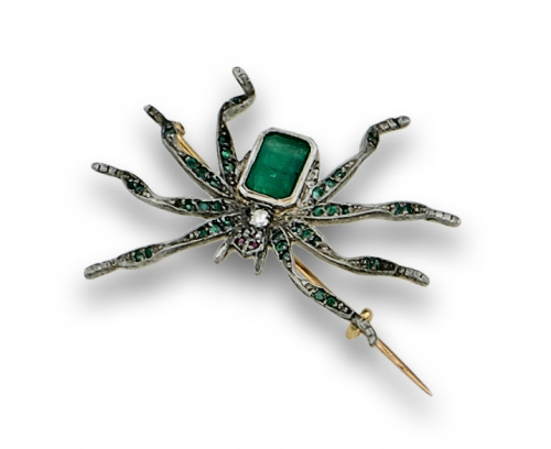 Broche araña Art-Decó con centro de esmeralda ,patas con esmeraldas y ojos de rubí.