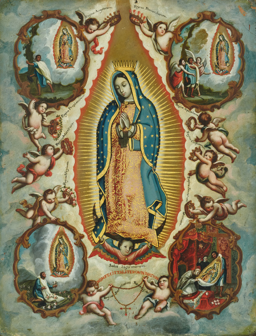 ESCUELA MEXICANA, SIGLO XVIIIVirgen de Guadalupe con escenas de sus apariciones al indio Juan Diego..