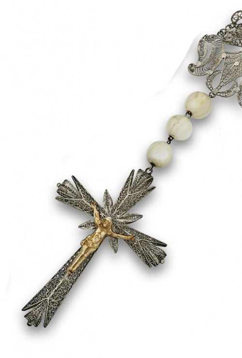 Rosario de pps s.XX con cuentas de nácar y filigrana de plata.