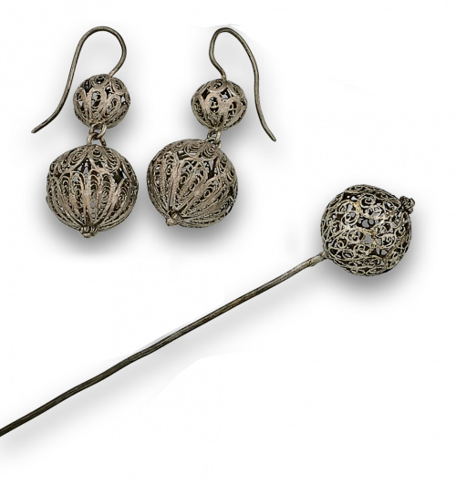 36. Pendientes largos y aguja populares s XIX con motivos esféricos de filigrana de plata.