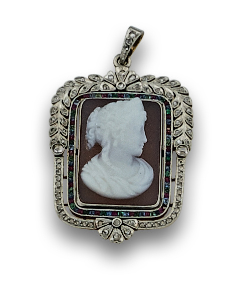 Colgante de pps s XX con camafeo de dama en ágata bicolor y delicado marco de diamantes.