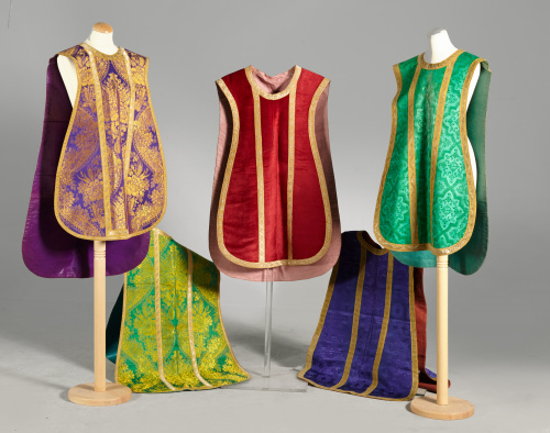 Juego de cinco casullas, cuatro en seda y una en terciopelo, con aplicaciones de galones. De diferentes colores para cada momento de la litúrgicos.España, S. XIX.