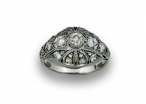 52. Sortija bombée años 30 de platino con diamantes en líneas caladas y brillante de talla antigua en chatón y línea central.