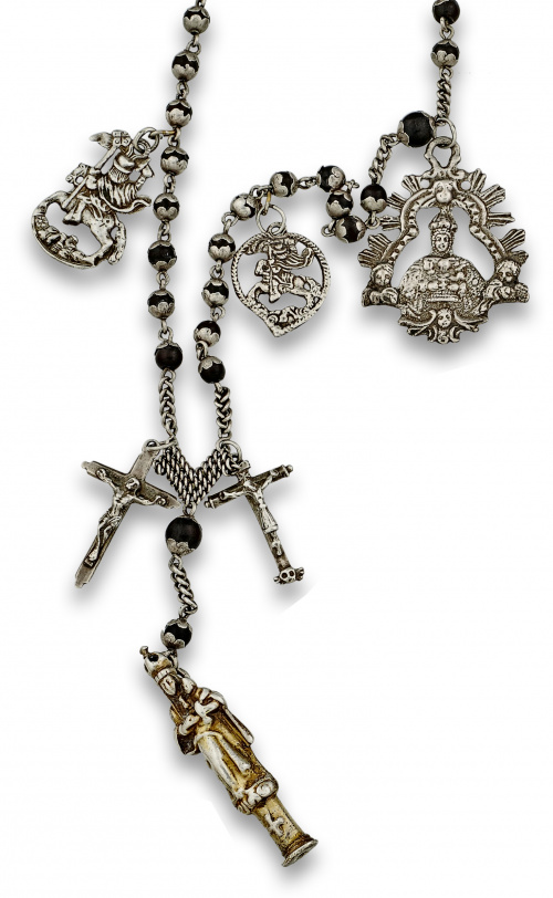 522. Rosario de plata s.XVIII con cuentas de madera cubiertas por dos capuchones a modo de flor.Con ocho medallas devocionales,dos crucifijos, y gran Virgen del Pilar colgantes.