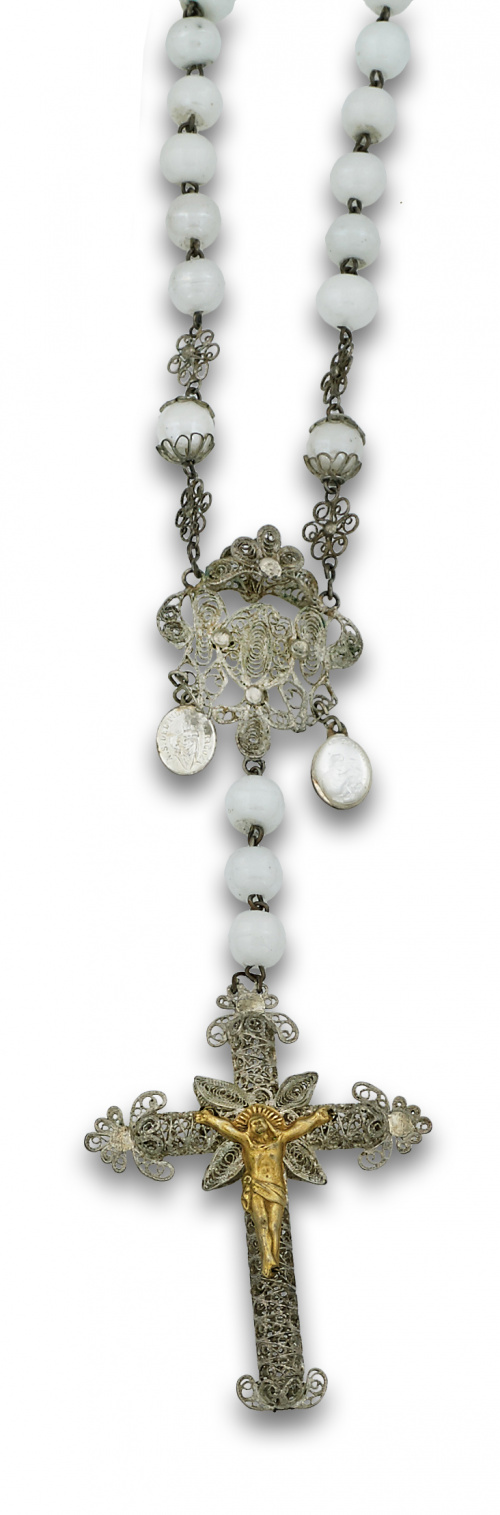 Rosario de cuentas de vidrio blanco y filigrana de plata. Con cruz en plata y vermeill y cuatro medallas colgantes.
